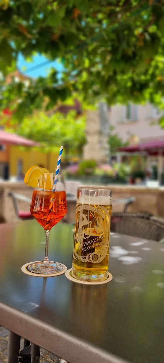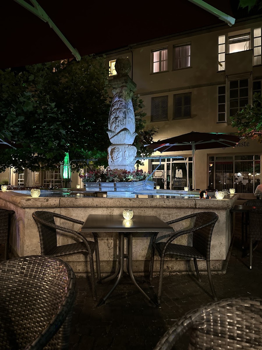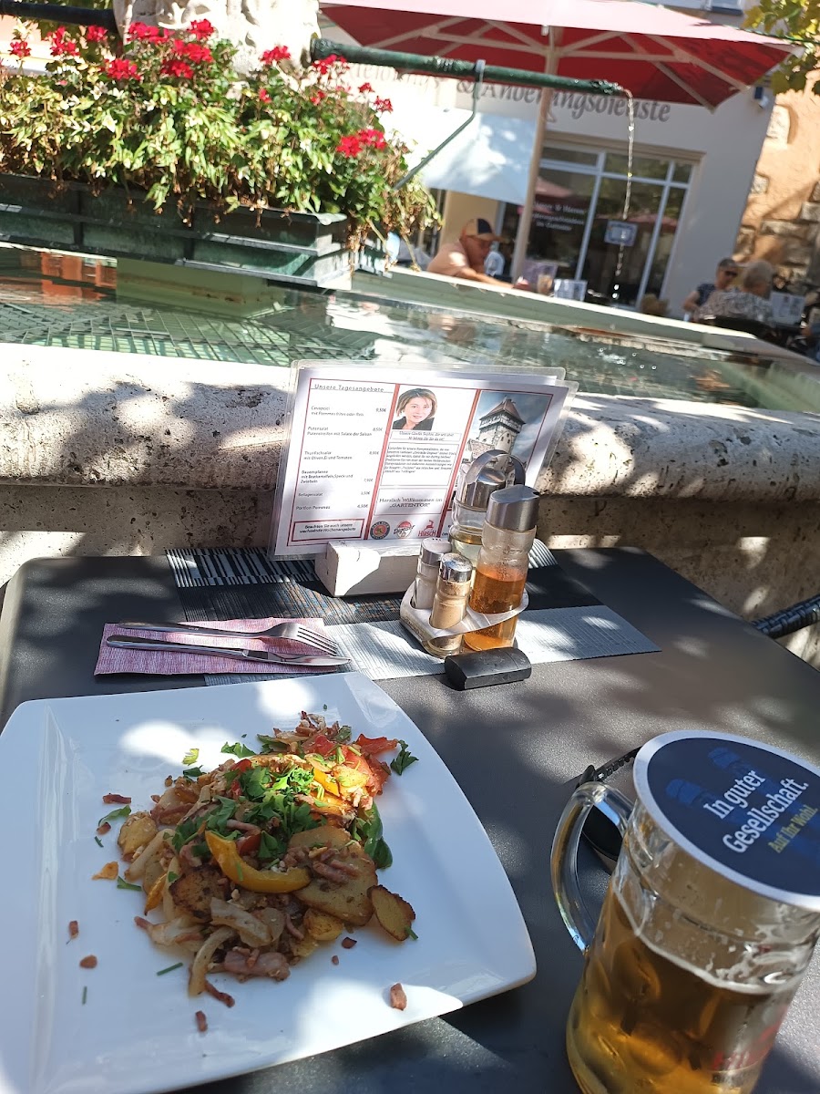Up front, cash only, good food, beer, and wine. Indoor and outdoor seating (seasonal). Of the 4 wait staff, only one spoke English, but this was not a problem as one can simply "point and click" so to say, if you didnt speak German. So, on my first journey out into Reutlingen, I stumbled upon this place; around noon on a Saturday in September. I sat outside right next to the fountain. I was immediately addressed and ordered a beer (Paulaner Hell). In less than 4 minutes after ordering that, I was approached by no less than 3 other servers asking to make sure I didn't need anything! Later, I ordered a simple "Bauerpfanne" (farmer's pan) for just under €8. It was delivered in about 5 more minutes. The food was excellent and the atmosphere was most calming. Despite the busier section of town only two streets over, it was quiet and calming. I paid with cash, but that's all that they take. Overall, when you see locals sitting and enjoying the atmosphere here, then you know you found a good place.